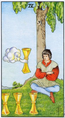 http://www.oculus.ru/image/blogs/36/docs/3601/m...00000008.jpg 44-Четверка Кубков Прямое положение: ЗНАЧЕНИЯ ДЛЯ ГАДАНИЯ: скука, отвращение, антипатия, мнимые неприятности, как будто вино этого мира вызвало только пресыщение; сейчас молодому человеку предложили как волшебный дар другое вино, но он не видит в этом утешения. Эта карта также говорит о частой смене развлечений. Обратное положение: ОБРАТНЫЕ ЗНАЧЕНИЯ: новость, предзнаменование, новые рекомендации, новые связи. Описание аркана: IV. Четверка - молодой человек сидит под деревом и созерцает три кубка, стоящие на траве перед ним. Рука, выходящая из облака, предлагает ему еще один кубок. Вопреки своему выражению лица, он не доволен окружающей обстановкой. Значения по Райдеру Уайту: АСТРОЛОГИЧЕСКОЕ ЗНАЧЕНИЕ: Марс в Раке как символ досады и обиды. ЧЕТВЕРКА КУБКОВ Настроение этой карты лучше всего определяется понятиями "пресыщение", "перебор". Помните о непостоянстве наших чувств: мы всеми силами души желаем чего-то, однако, достигнув этого (и даже большего, чем желали), вдруг понимаем, что нам это не нужно, и нас охватывают уныние, обида и отвращение. Это может выражаться в брюзжании, равнодушии или наоборот, раздражении, отчаянии и стремлении все разрушить. Так или иначе, эта карта служит предостережением: не давайте своему дурному настроению перерасти в апатию, чтобы не упустить благоприятного шанса и не оттолкнуть руку помощи. ЧЕТВЕРКА КУБКОВ Роскошь Третья декада Рака с 12 по 22 июля. Астрологические эквиваленты: Рак, Юпитер в Раке, Луна, Нептун. Третья декада Рака управляется Луной и символизирует непосредственность и простоту эмоций, проявленных вовне. Эта декада обладает богатым воображением и склонна к созерцанию и мечтам. Если вторая декада занята выработкой механизма переключения с внутреннего восприятия на внешнее, то третья обладает налаженной системой каналов связи внутреннего и внешнего и максимально задействована в процессе передачи своих впечатлений и эмоций другим. Основой богатства внутренних ощущений здесь является внешний мир. Эмоции соответствуют объективности и позитивно воспринимаются другими. Жизнь передается как неисчерпаемый источник чувств, и их бесконечный поток позволяет человеку ощутить непрерывность и вечность жизни. Эта декада несет идею неведомых возможностей, скрытых в глубинах самой жизни, которые надо увидеть и понять. На карте ТАРО изображен сидящий под деревом юноша, перед ним - стоят три кубка. Рука из облака предлагает ему четвертый, но молодой человек его не замечает. Этот дар свыше может быть для него потерян. Мечтательность делает его слишком инертным, а его представления слишком размытыми. На этапе ЧЕТВЕРКИ КУБКОВ желание обретает конкретные формы, хотя эти формы еще не полностью соответствуют нашему несовершенному миру - они несколько идеализированы и неконкретны, но вместе с тем достаточно материальны. В высшем своем проявлении ЧЕТВЕРКА КУБКОВ символизирует всепрощение, вместе с тем, она может означать и разочарование в объекте любви, в окружающих людях, а также усталость, отвращение, ощущение себя несчастным. Получение горького опыта, начало пустого застойного периода в жизни. В чем-то эта карта созвучна знаку Рака. Он вылез из своей скорлупы, был в очередной раз уязвлен и забрался обратно. В этой теме звучат Луна и Сатурн, и эта карта будет особенно си