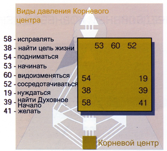 Корневой центр — это центр давления. Это давление снизу, давление эволюционировать и приспосабливаться к миру и жизни. Это давление быть. Этот центр отвечает за то, как человеческое существо переносит и выражает стресс, и это то давление, которое движет нас по жизни. Корневой центр — это ещё и мотор, обеспечивающий топливом наше развитие. Здесь мы находим основное топливо для существования нашего транспортного средства. Это самая мощная, чистая энергия, которая только есть y нас внутри. Корневой центр также называется центром Кундалини, то есть Вы имеете дело c огнем Кундалини. Будучи центром давления, он питает энергией девять разных процессов. Люди с неопределённым Корневым центром находятся под очень большим давлением. Они принимают и усиливают стресс. Их обуславливают быть гиперактивными и они могут совершенно лишиться отдыха. Увидев однажды, что это давление не является их давлением, они научатся не давать ему захлестывать их. В стрессовой ситуации они могyт воспользоваться этой энергией адреналина или отойти в сторону и избежать её.